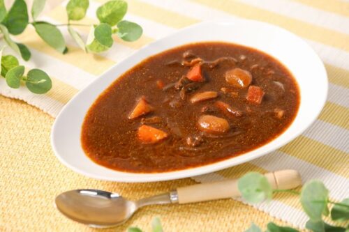 福井県は六条大麦の生産量が日本一。六条大麦粉で作った「六条大麦デミグラスソースルゥ」を使って福井のブランド牛「若狭牛」とコラボしたビーフシチューです。