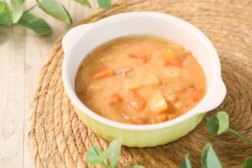福井県は六条大麦の生産量が日本一。六条大麦粉で作った「六条大麦クリームシチュールゥ」を使用した甘くて優しい味のシチューです。